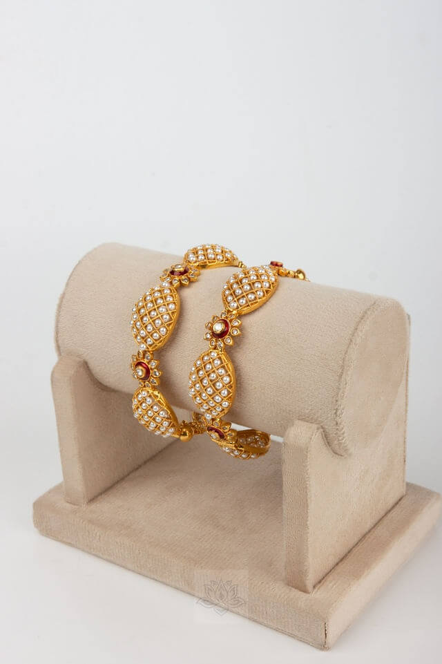 Design: Pearl-studded oval motifs with CZ & red-stone floral connectors