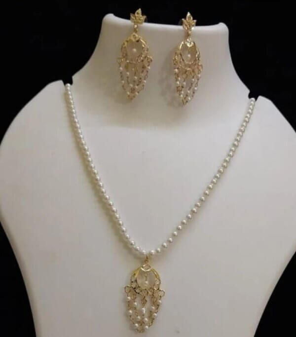 ✔️ Matching drop earrings with intricate gold detailing and dangling pearls