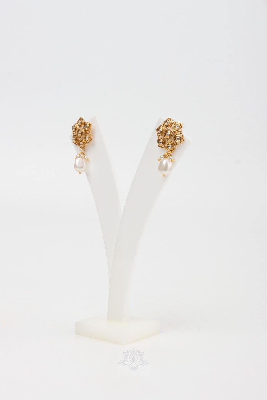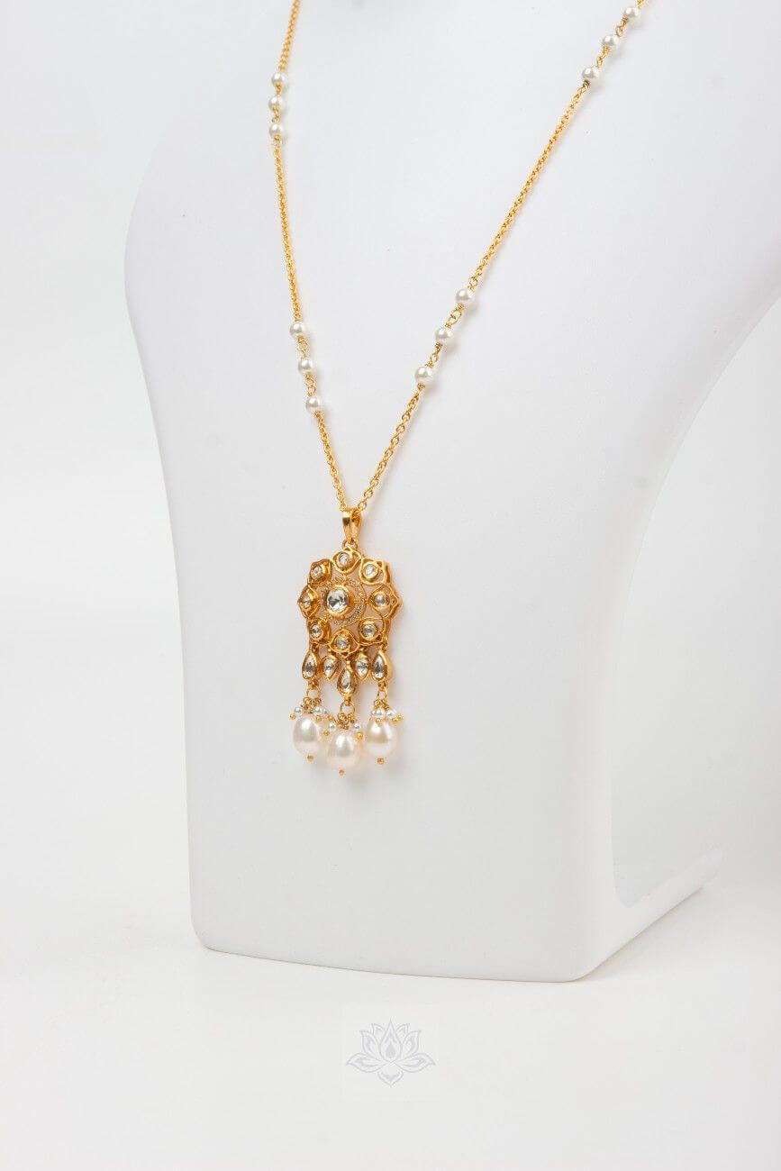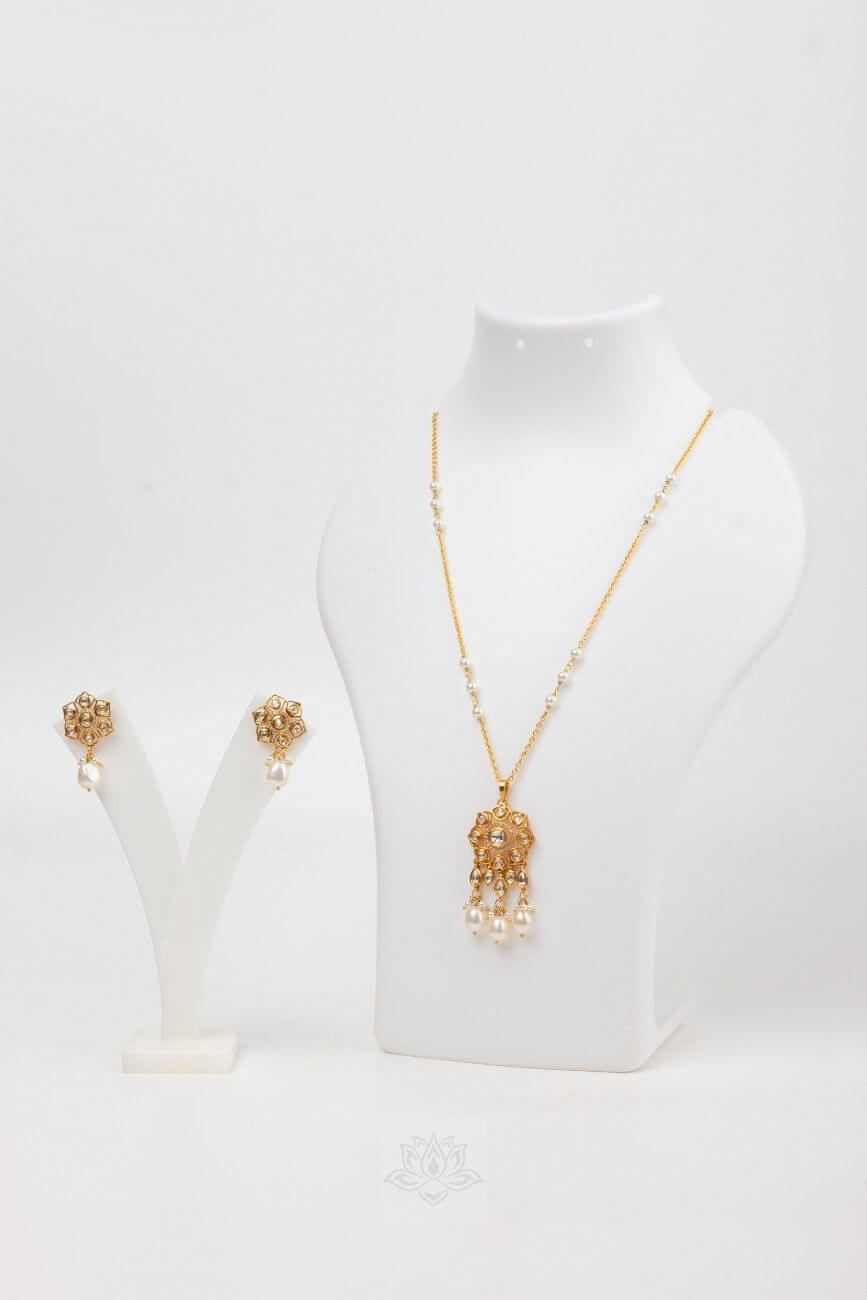 Adorn yourself with the timeless elegance of our Shri Mangal Product necklace and earring set. This exquisite jewelry features a high-quality silver base meticulously plated with radiant gold, creating a luxurious and sophisticated look. The intricate design of the pendant and matching earrings is adorned with dazzling stones and delicate pearl drops, adding a touch of classic charm.