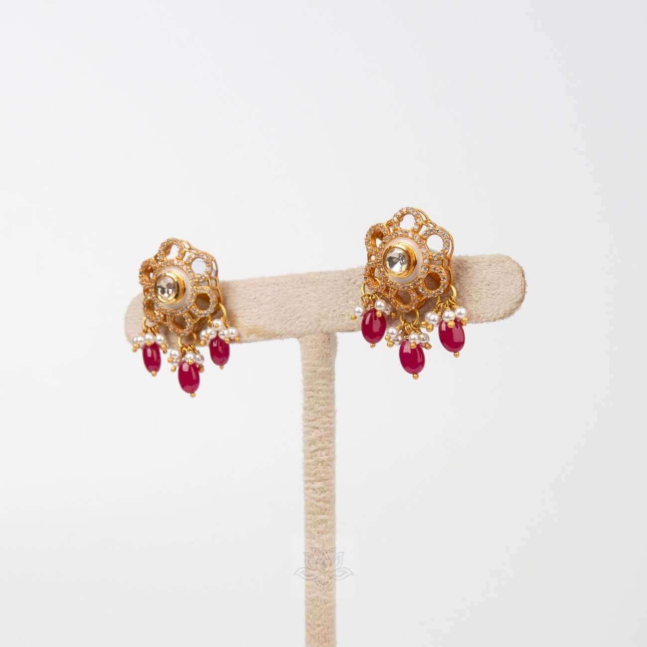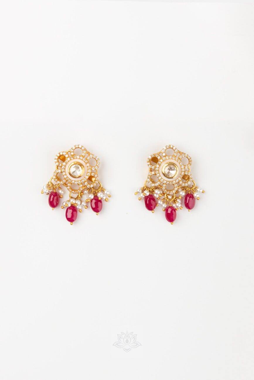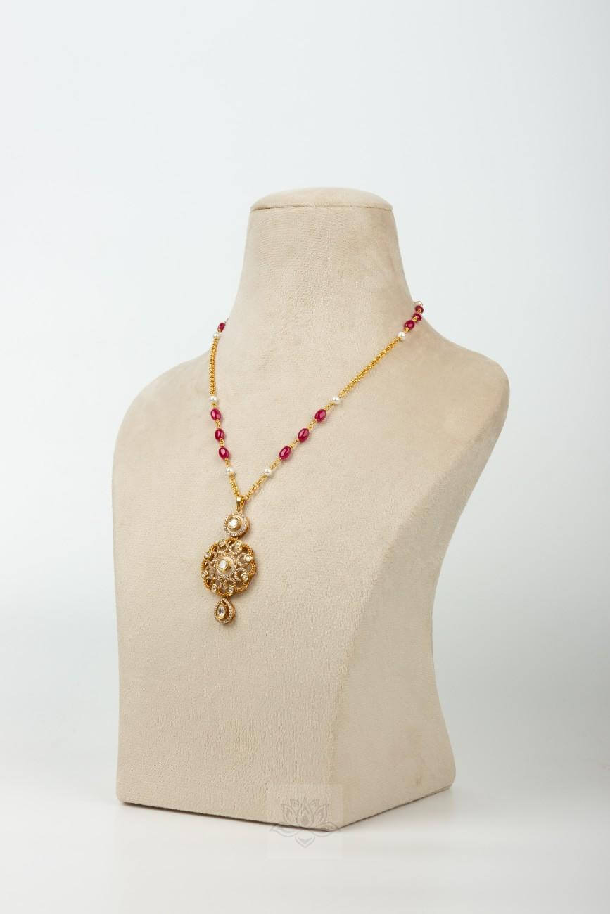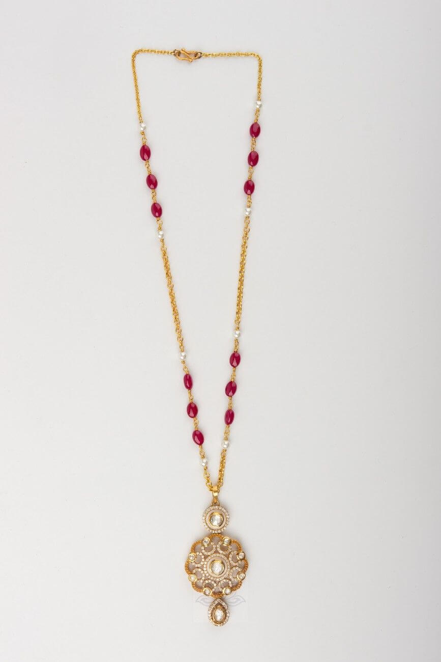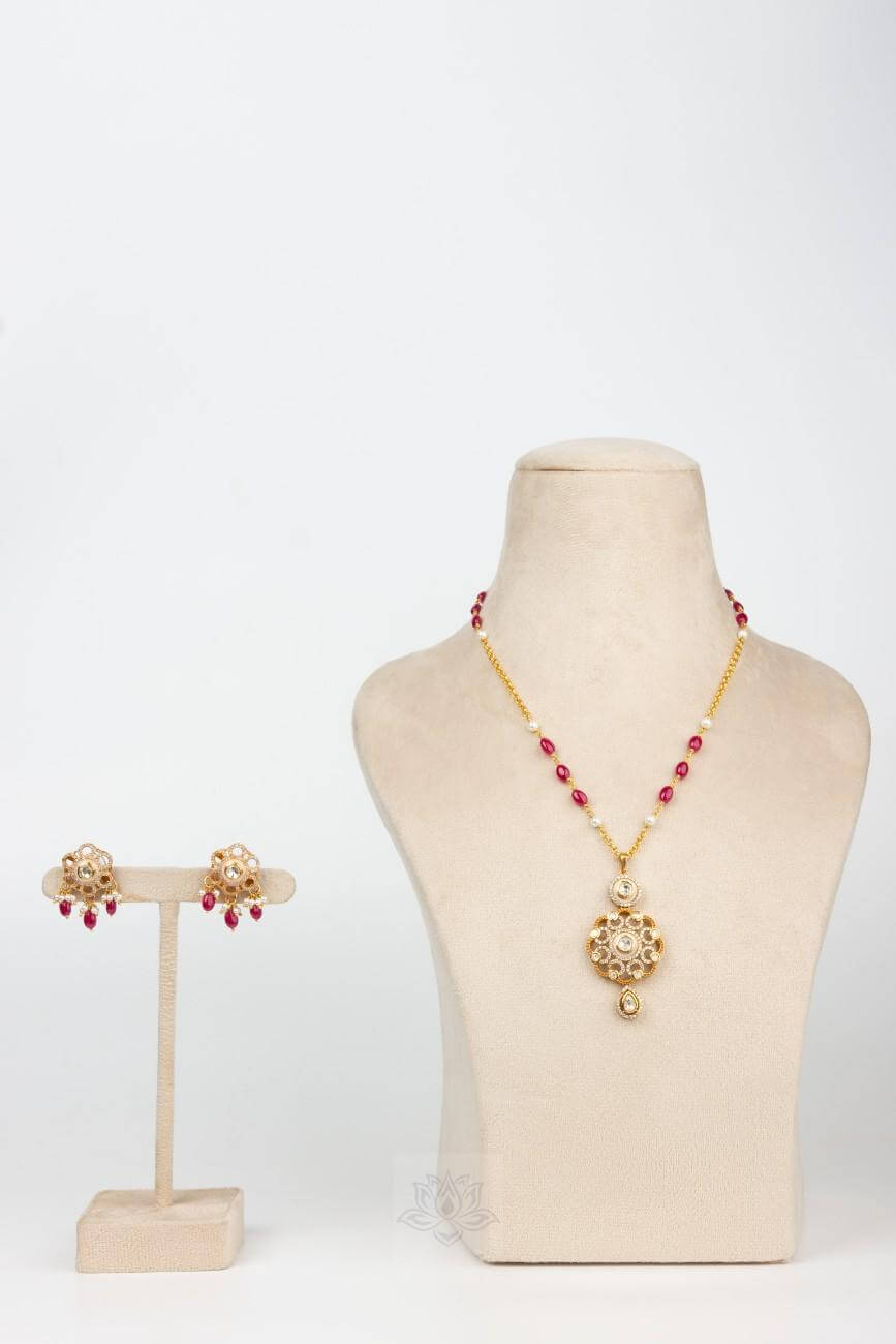 Elevate your festive or bridal look with this intricately crafted silver-base necklace set, luxuriously plated in gold. This elegant design features a delicately detailed pendant adorned with uncut kundan-style stones and vibrant red beads, perfectly matched with a pair of statement earrings.